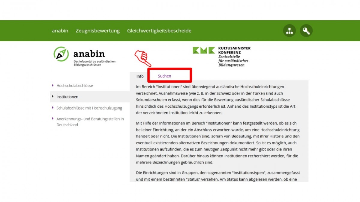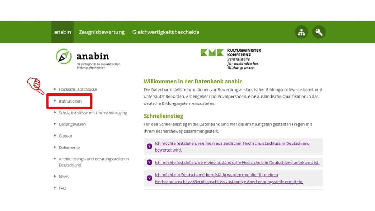 متقاضیان کار و تحصیل در آلمان باید مدارک تحصیلی خود را ارزیابی کرده و در صورت لزوم تاییدیه آن را به دانشگاه یا سفارت ارائه دهند. مرکز ارزیابی KMK تنها مرجعی معتبری است که لیست دانشگاههای ایرانی مورد تایید آلمان در آن وجود دارد. این مرجع از دو بخش تشکیل شده است. رشته و دانشگاه باید در سایت آنابین مورد تایید باشد، در غیر این صورت باید مراحل تاییدیه zab طی شود.